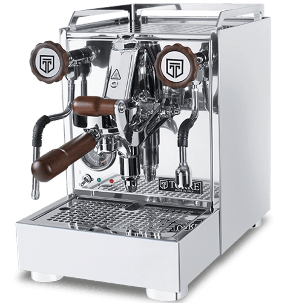 De Luigino espressomachine is standaard met kunstof handgrepen en optioneel te verkrijgen met houten handgrepen.